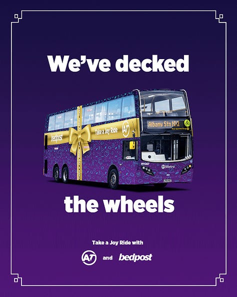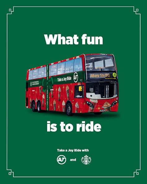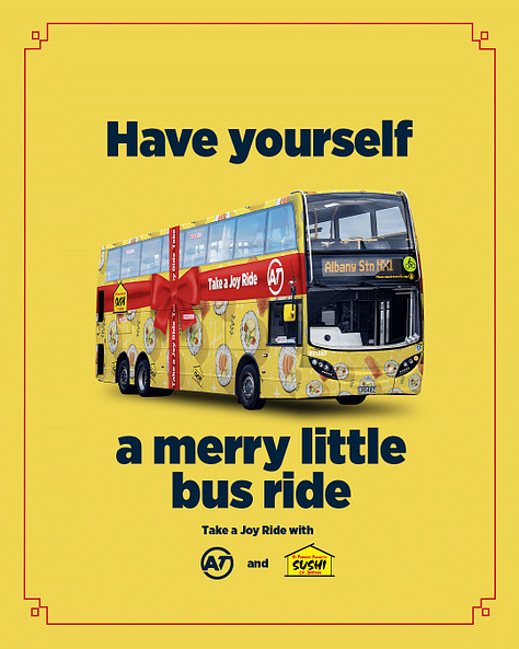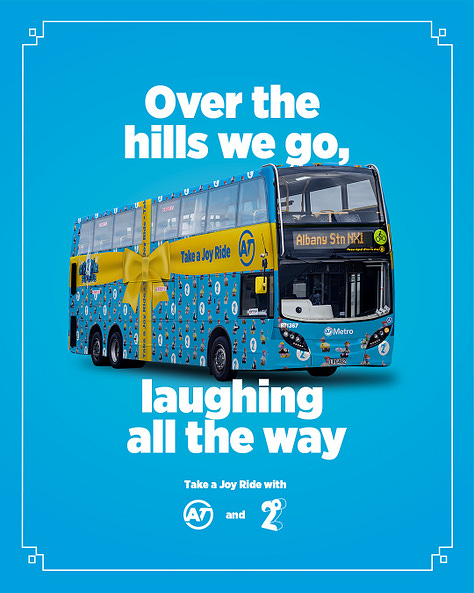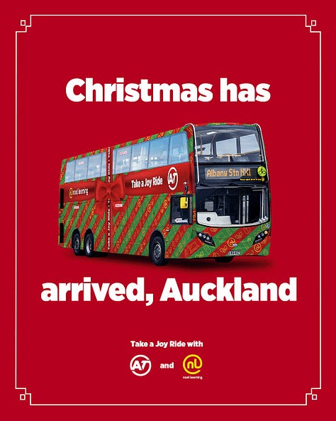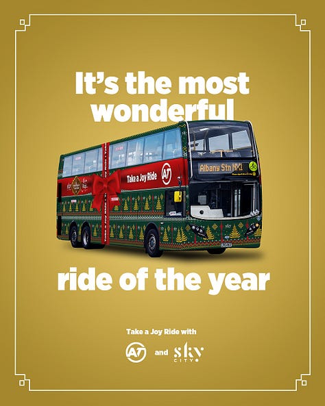 In addition to the Auckland Transport branded ‘Take a Joy Ride’ Christmas bus, there are Noel Leeming, St Pierres, Bedpost, Starbucks, 2Degrees and SkyCity branded joy ride buses. Each bus will feature a wrapping paper design for the brand, with the gift bow look retained.