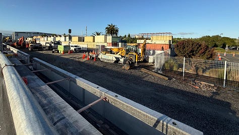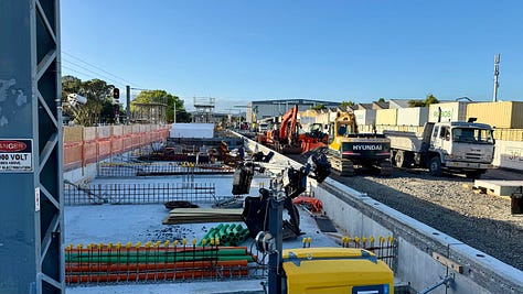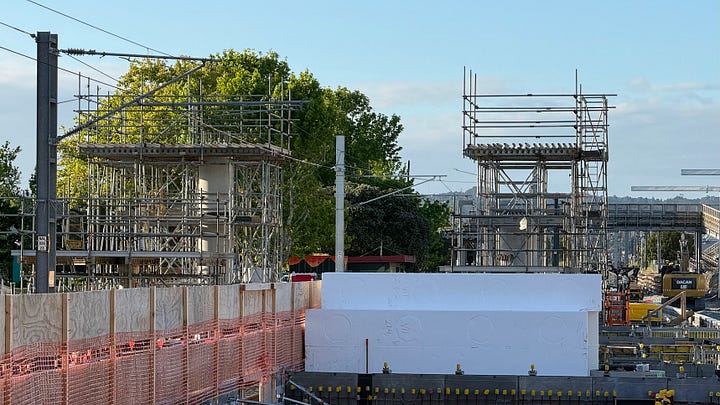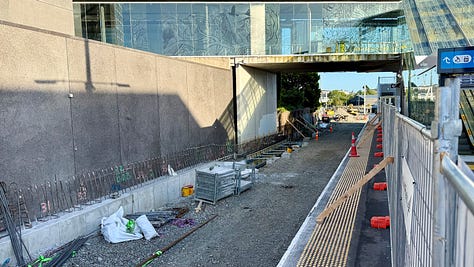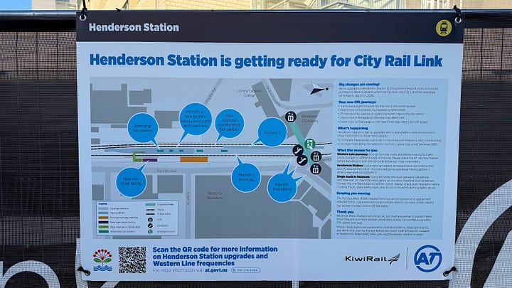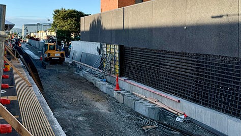Works at Henderson Station have progressed further with the construction of a new protection/retaining wall against the council building. New platform edges have also been lifted into place on the new platform 3 and the existing platform 2. A map showing the works underway has also been added to the temporary fencing on the platforms.