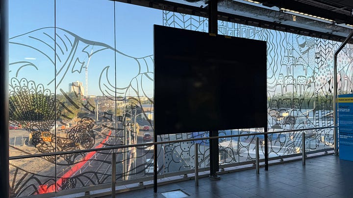 Auckland Transport are installing new live departure signage on the Henderson Station access bridge to show live departures for trains and buses. A large black bracket has been installed at the top of the Railside Avenue escalators, with TVs being attached overnight on Tuesday.