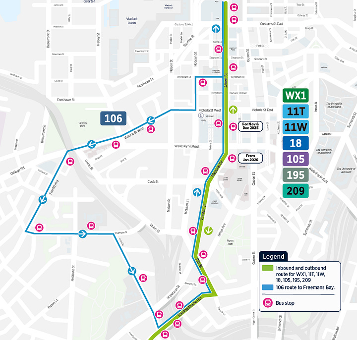 Routes WX1, 11T, 11W, 18, 105, 106, 195 and 209 will no longer travel in or out of the city using Queen, Hobson or Wyndham Street.