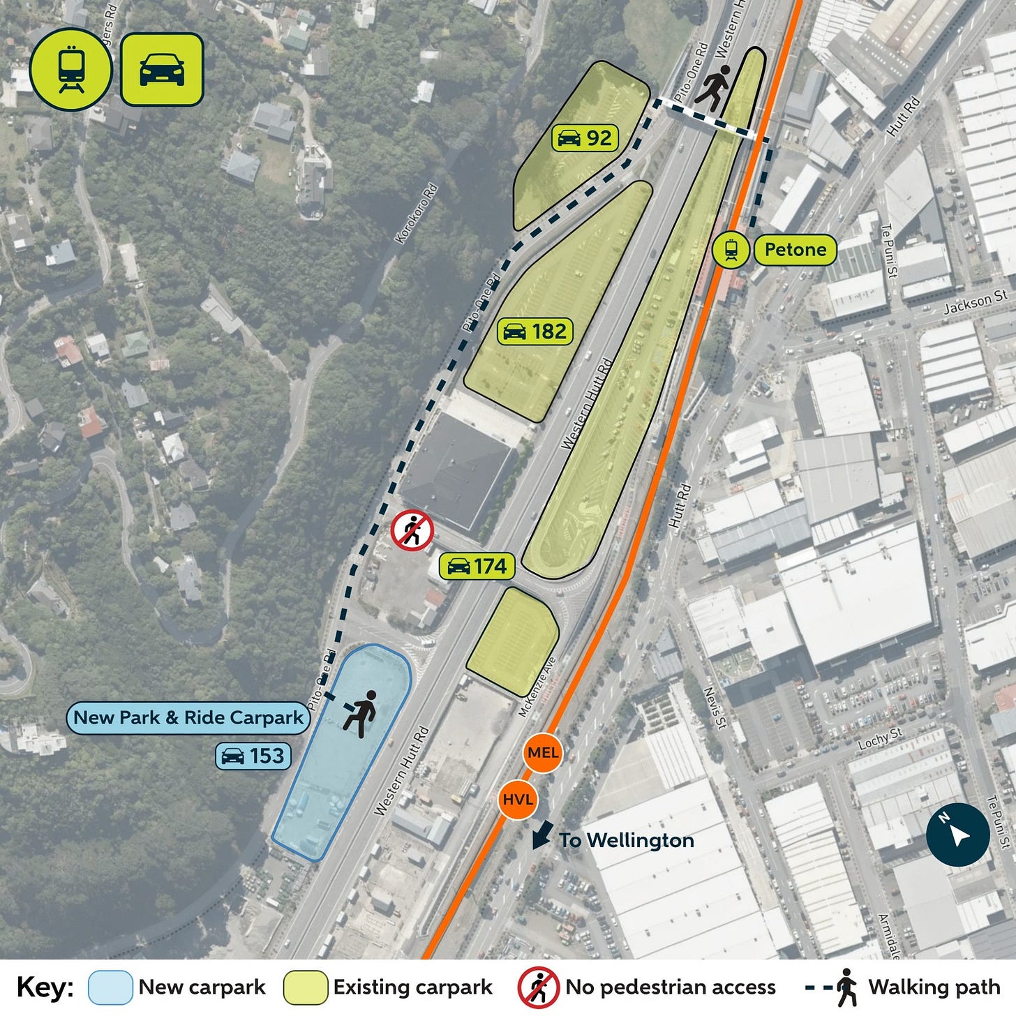 153 extra parking spaces have opened at Petone Station Park & Ride. The Park & Ride has been fitted with lighting and CCTV. Pedestrian access to Petone Station is via the pedestrian overbridge on Pito-One Rd only.