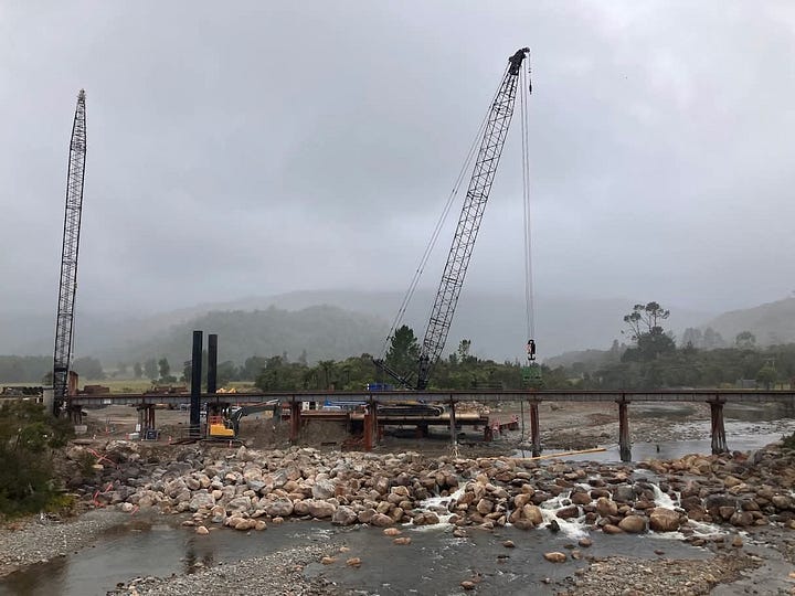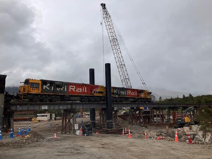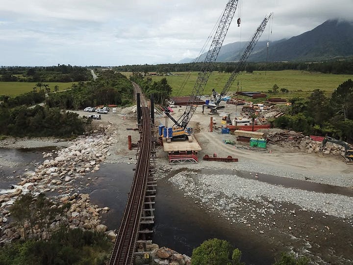 KiwiRail has shared images of the progress at Bridge 133 on the Stillwater-Ngākawau Line. The existing timber & steel bridge, which is more than 100 years old, is being replaced with a modern concrete & steel structure that is more resilient to seismic & flooding events.